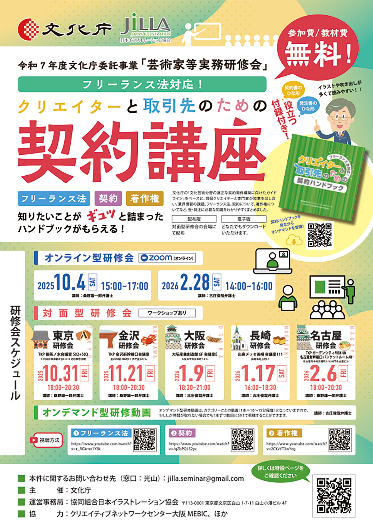 フリーランスクリエイターと、クリエイターに発注する機会のある事業者を対象に、実務に詳しい弁護士がフリーランス法(正式名称:特定受託事業者に係る取引の適正化等に関する法律)はじめ、契約についてや、著作権について、詳しく解説する研修会です。