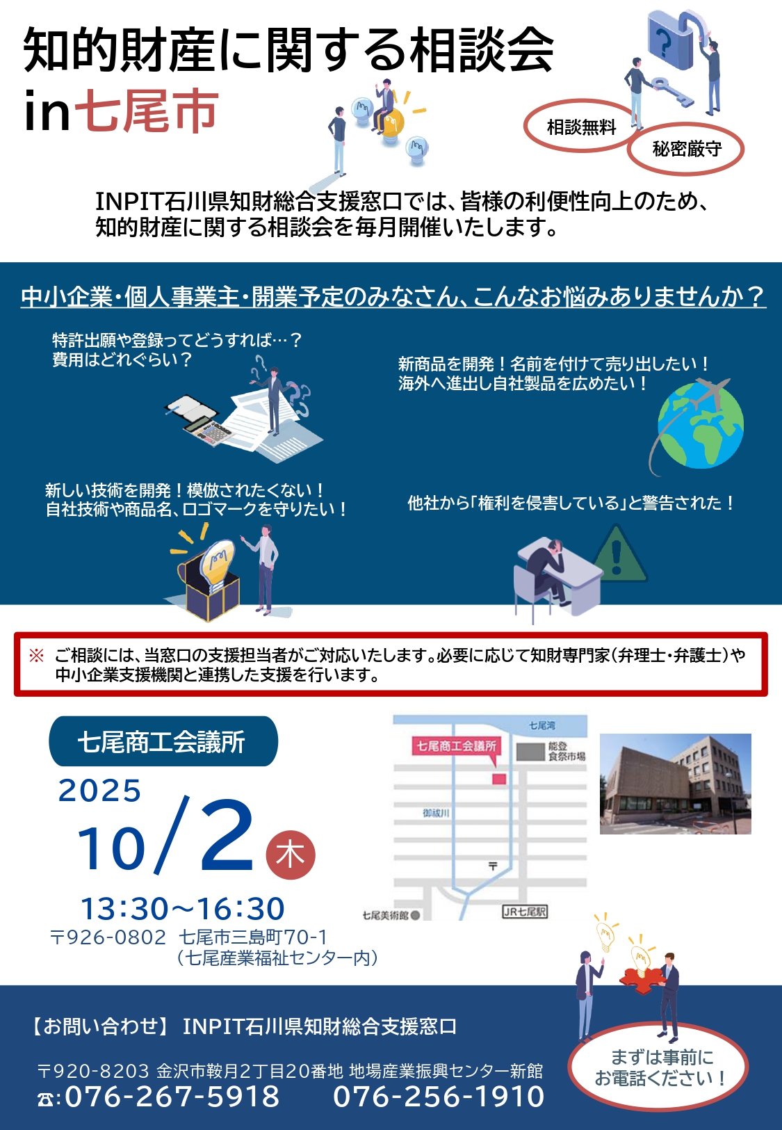 INPIT石川県知財総合支援窓口では、皆さまの利便性向上のため、毎月第1木曜日に七尾市で知的財産に関する臨時相談窓口を開催しております。