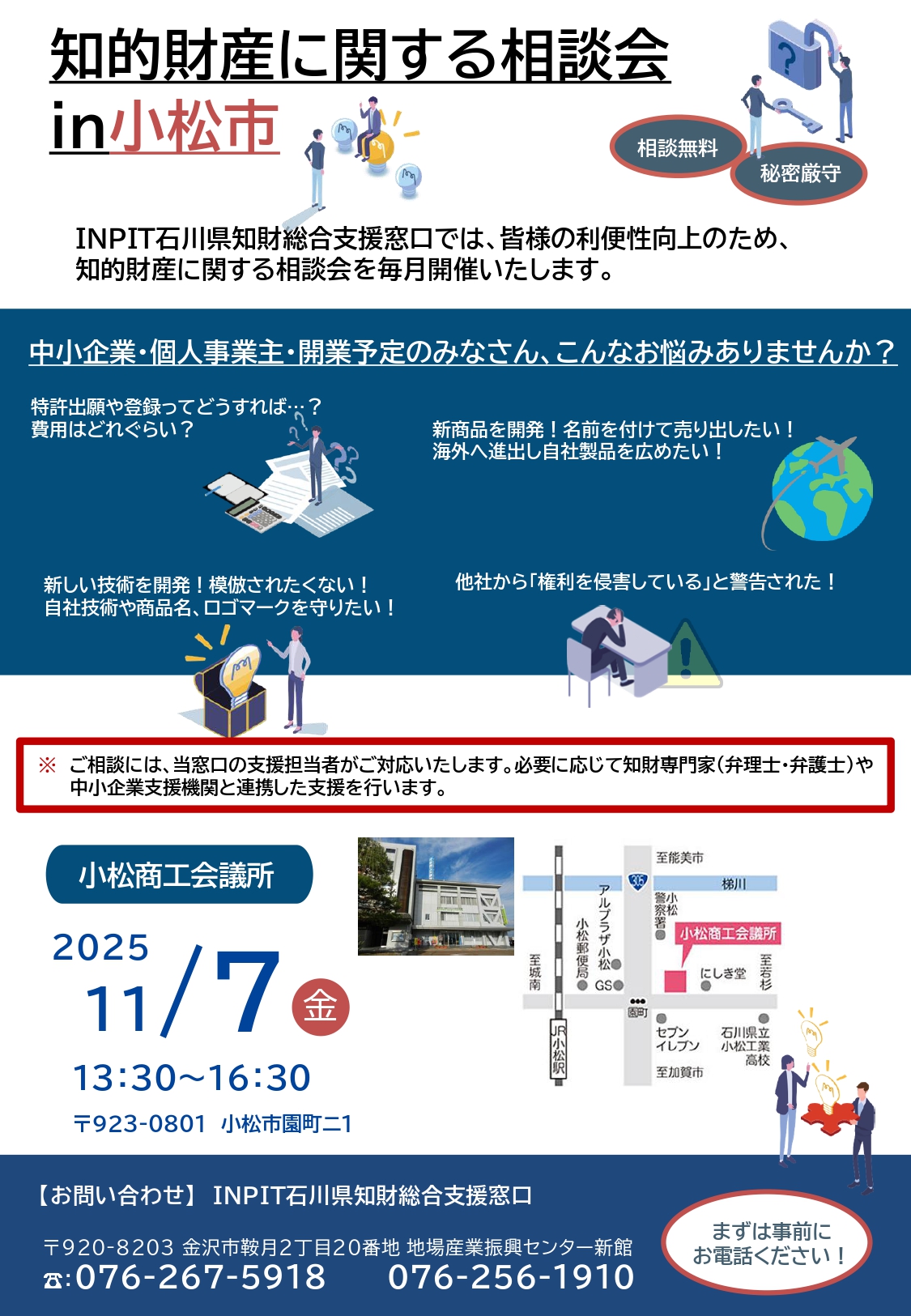 変更となる場合がございますので、来所の際はINPIT石川県知財総合支援窓口ホームページをご覧になるか、お電話でご確認ください。