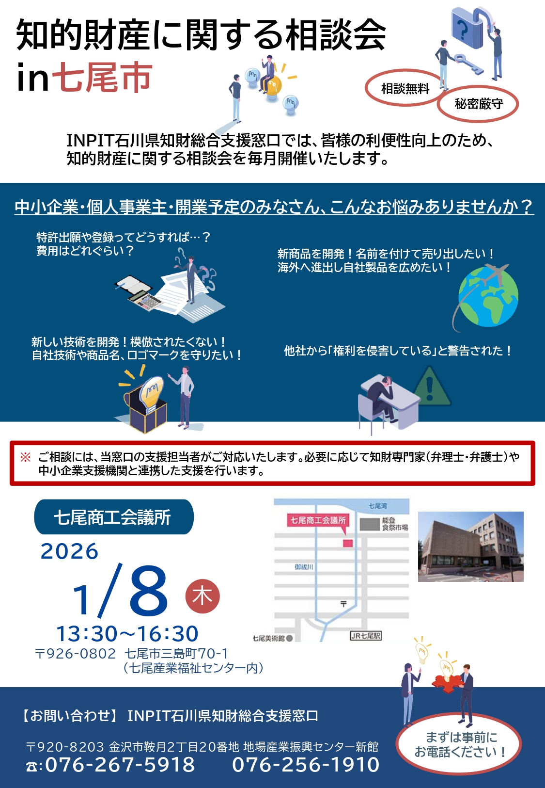 変更となる場合がございますので、来所の際はINPIT石川県知財総合支援窓口ホームページをご覧になるか、お電話でご確認ください。