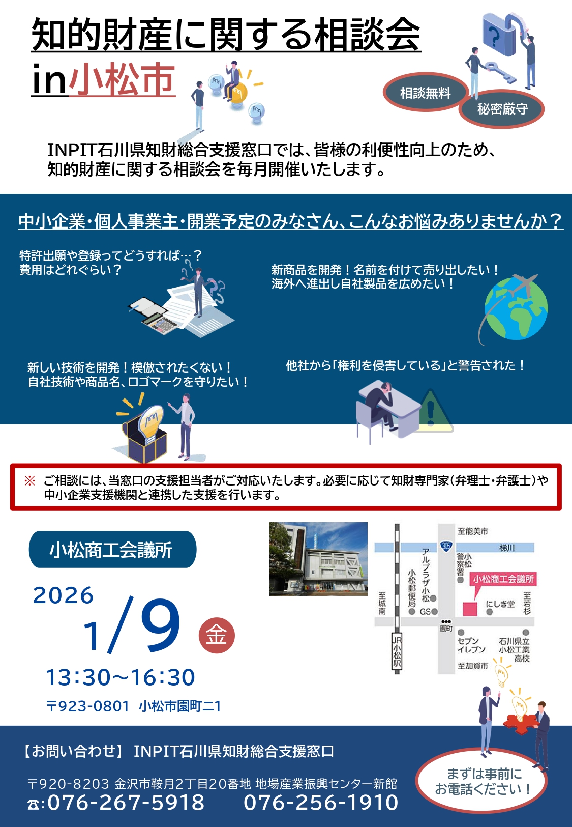 変更となる場合がございますので、来所の際はINPIT石川県知財総合支援窓口ホームページをご覧になるか、お電話でご確認ください。
