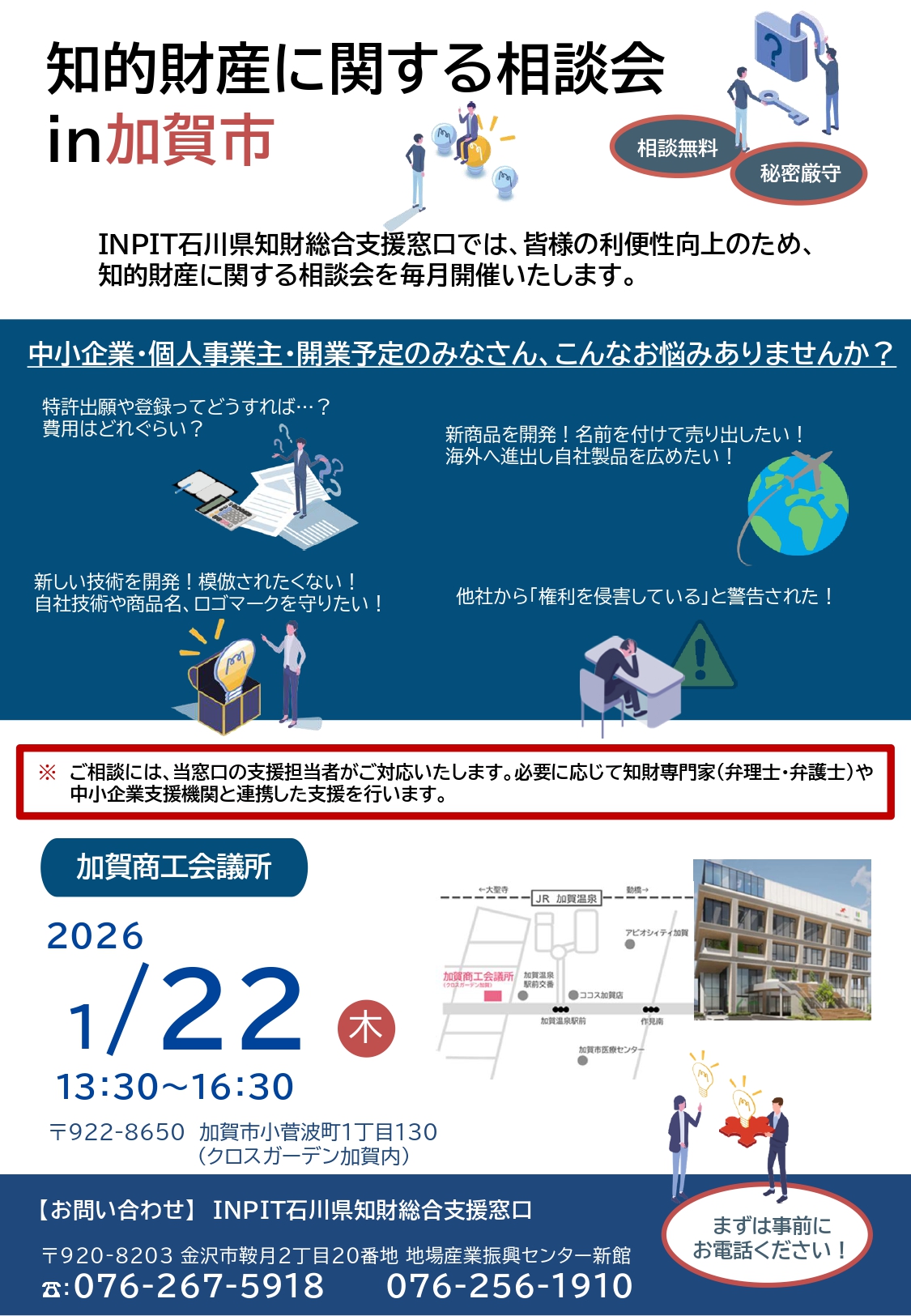 石川県知財総合支援窓口では、皆さまの利便性向上のため、毎月第4木曜日に加賀市で知的財産に関する臨時相談窓口を開催しております。