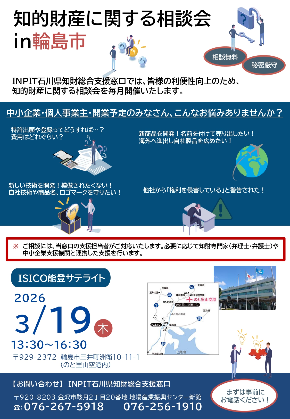 INPIT石川県知財総合支援窓口では、皆さまの利便性向上のため、毎月第3木曜日に輪島市で知的財産に関する臨時相談窓口を開催しております。