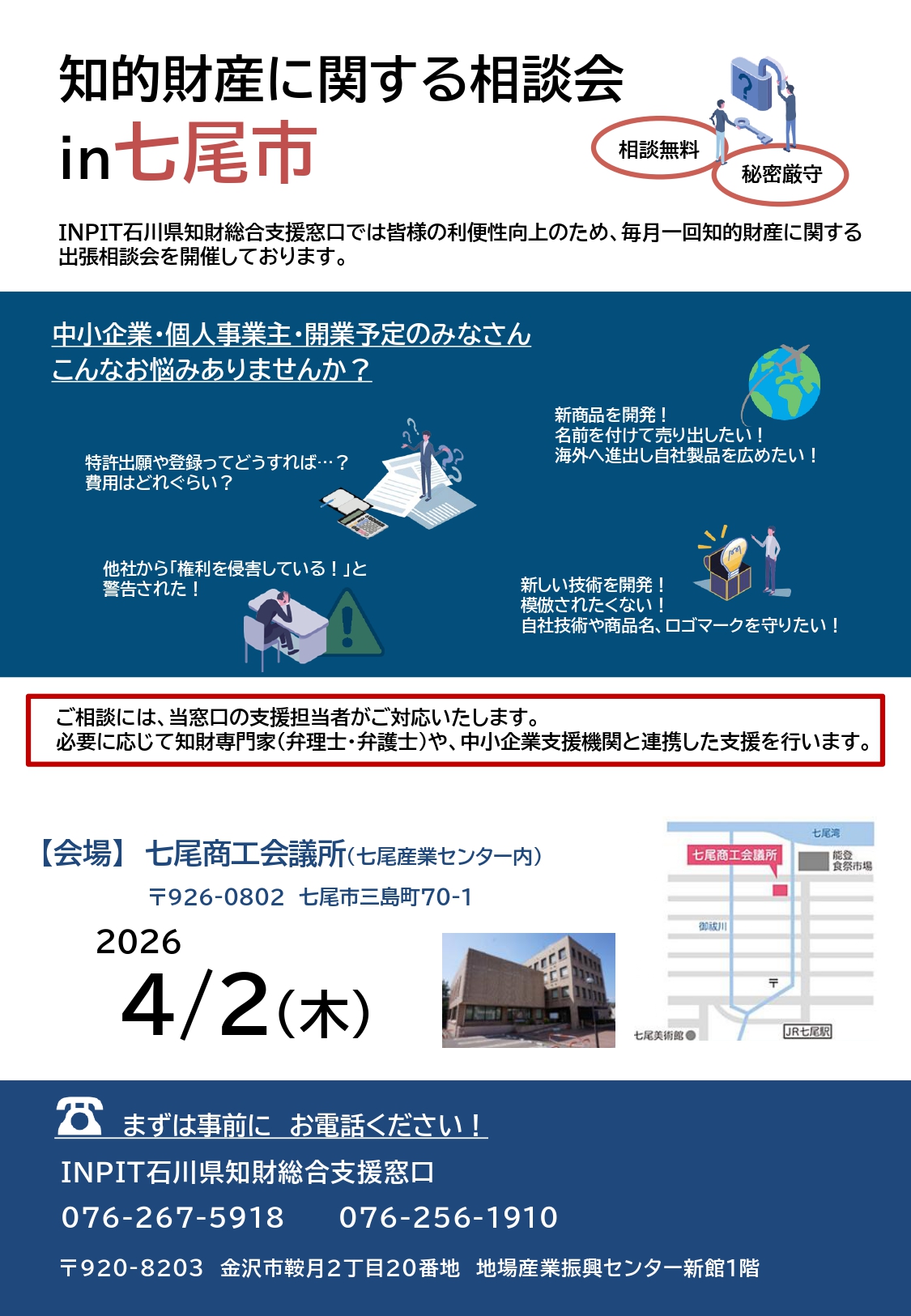 INPIT石川県知財総合支援窓口では、皆さまの利便性向上のため、毎月第1木曜日に七尾市で知的財産に関する臨時相談窓口を開催しております。
