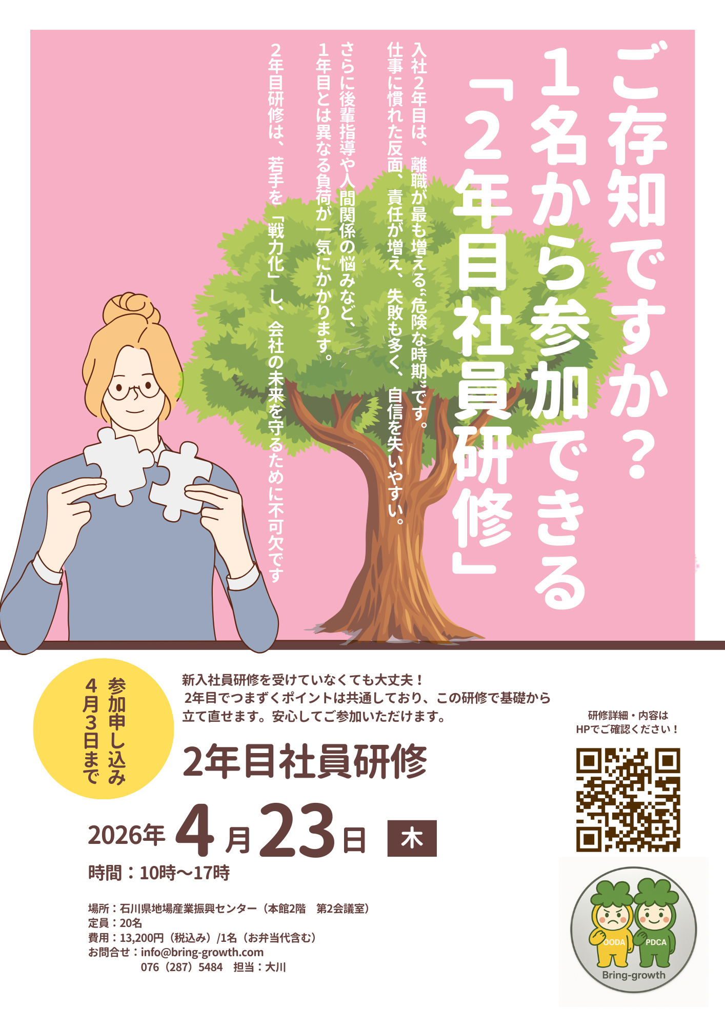 または、以下のアドレスに「2年目社員研修 申込希望」と記載いただき、メールを送信していただければ、こちらからご連絡いたします。