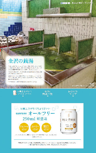 ビットストリームが運営する地域情報のポータルサイト「あるんけ金沢」では、サントリーと連携し、金沢市内の銭湯を紹介する特集を組んでいる。特集では石川県公衆浴場業生活衛生同業組合金沢支部に所属する27軒が掲載されており、このうち冷蔵庫のある25軒でアルコール、カロリー、糖質をゼロにしたサントリーのビールテイスト飲料「オールフリー」250ml缶を販売するキャンペーンを展開している。キャンペーンはオールフリー250ml缶の発売日に合わせ、今年6月11日にスタートした。