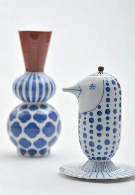 新商品のラインアップは徳利、湯飲み、急須、丸皿など31点。いずれもハイメ氏がデザインした文様が、長右衛門窯の持ち味である深い藍色の染付をベースに表現されている。また、愛らしい小鳥のくちばしが注ぎ口となったしょう油差し、口や鼻を模して、組み合わせると人の顔のようになる小鉢など、器の形にもハイメ氏の感性が生かされている。