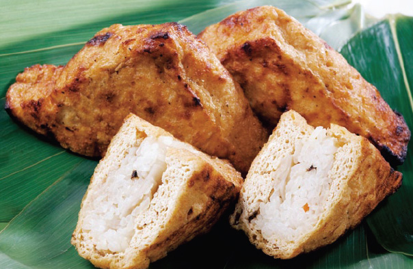 「守岡さんちの焼きいなり」は、白山麓の伝統食品である堅豆腐を厚揚げにして、その中にいなりずしのようにご飯を詰め込んだもの。国産大豆と白山の伏流水、天然のにがりで製造された厚揚げをはじめ、白山市内の契約農家が低農薬で育てた米や能登産の地鶏、地元産しょう油など素材を厳選。大豆の旨味と焼いた揚げの香ばしさが口いっぱいに広がる逸品だ。