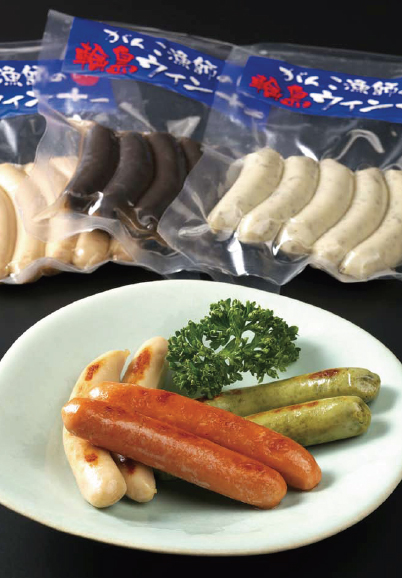 一夜干しやいしるなど水産加工品の製造、販売を手がける舳倉屋は、能登産の海産物を使った「輪島ウインナー」を開発した。原材料はすべて地元産にこだわり、県内で水揚げされたスルメイカや甘エビ、海女が手摘みした海藻を使用。自家製のいしるで下味を付けている。商品ラインアップは「イカ」