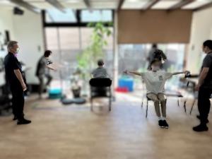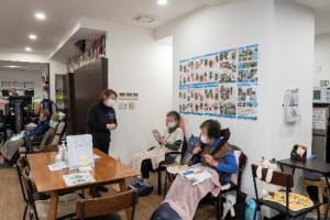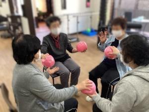 普段慣れない動きをすることで脳に適度な刺激を与えて活性化を図るプログラム及び手段であるシナプソロジーを導入している。「2つのことを同時に行う」「左右で違う動きをする」などの簡単な基本動作をまず覚えてもらう。その後、五感からの刺激や認知機能への刺激を変化させていき、それに反応することで脳を活性化させていく手法のことで、複数人で楽しく行うことで、感情や情動に関係した脳機能も活性化され、認知機能や運動機能の向上と共に、疲労感や抑うつ感の低下も期待されるとのこと。大人数で運動することで、あちこちから笑い声が聞こえ、マスク越しではあるが、みんなが笑顔で運動している様子が見て取れ、相乗効果が確実に出ていることを体感させられる。