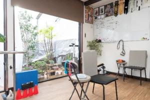 西村さんは大の猫好きで、自宅で猫を飼っていることもあり、施設の玄関にはかわいい猫のスリッパが並べられ、来客を和やかなムードで出迎えてくれる。なおかつ西村さんが明るく元気な声掛けで迎えてくれ、デイサービスの施設に来たことを忘れるぐらい、とにかく明るい雰囲気が第一印象。レストランの面影が残る壁や天井の装飾を活かしつつ、デイサービスの施設としてゆったりと使えるように改装。レストランの厨房だったスペースは、壁や厨房機器を全て撤去し、床を補強して、今はフィットネスマシンがずらりと並べられている。中庭に面して大きなガラス張りのつくりであるおかげで、施設内が明るく、より開放的な雰囲気を醸し出している。