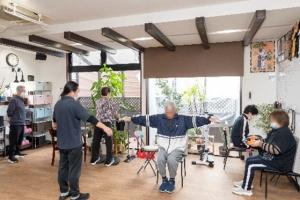 利用者の皆さんを送迎車で市内の自宅まで迎えに行く→施設到着後、血圧や体温など運動前の体調チェック→グループに分かれての運動・マシントレーニング⇔癒しタイム(マッサージ器具や水分補給など)→スタッフによる日替わりプログラム(シナプソロジーや集団運動等)→送迎車で利用者の自宅まで送るというのが、大まかな流れ。屋内での運動だけでは歩行能力の維持・向上をしていくには不十分なことから、定期的に近隣の公園や博物館、工場等の普段なかなか歩くことが少ない場所への屋外歩行訓練の機会も設けている。スタジオ内の運動風景を眺めていると、あちこちで利用者の笑い声が上がり、笑顔で楽しそうに運動する姿が見受けられ、利用者にとって楽しみなひとときであることが一目瞭然。そうした雰囲気を創り出す上で、西村さんの声掛け、気配り、目配りは素晴らしく、いろんな場面でユーモアを交えながら、常に利用者のお年寄りに笑う機会を巧みに演出している。現在は西村さんを含めて介護福祉士2名、社会福祉士1名、作業療法士1名、介護士1名、准看護師3名の体制で運営している。