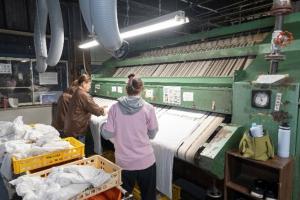 現在は社員、パート、外国人実習生の約70名体制で稼働し、15台のトラックで納品・回収してきている。こちらの業界でも、さまざまなコスト増と人手不足が最大の悩み。ドライバーの高年齢化が進んでいることから、若手を採用したいのだが、なかなか求人しても応募がない状況が続いている。工場は18名の外国人実習生が大きな戦力で、「彼女たちがいないとうちの工場は回りません。これからもっと活躍してもらえるように、福利厚生・給与面でも厚遇しています。」と守岡社長は力を込める。給与水準は日本人と同等であることはもちろんのこと、社宅も無償で供与。人一倍頑張って貯金し、家族に仕送りしている実習生たちの姿に守岡社長は感心している。洗濯・乾燥・プレスといずれも蒸気の出る暑い環境のため、夏場はスポットクーラーを設置するなど工夫しているが、熱源のある環境のため、環境面はなかなか難しいのが現実。温泉旅館が主要な取引先のため、日曜祭日の稼働率が高く稼ぎ時のため、同社もそれに対応せざるを得ず、交代勤務で何とか週休二日を実現している。